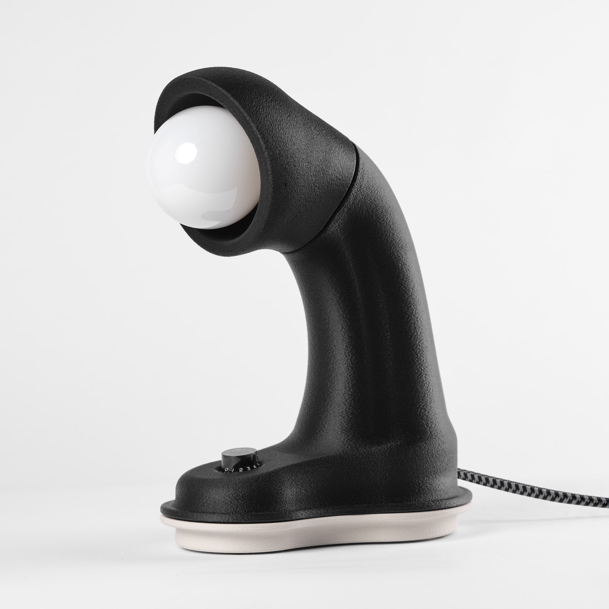 The Nessi table lamp gently raises its head above the surface. Available in short and tall versions, this fully dimmable lamp features a G-25 globe bulb that appears to float in a void. The weighted base adds heft to prevent wobbles. Felt glides and a cloth-covered cord add the finishing touches.